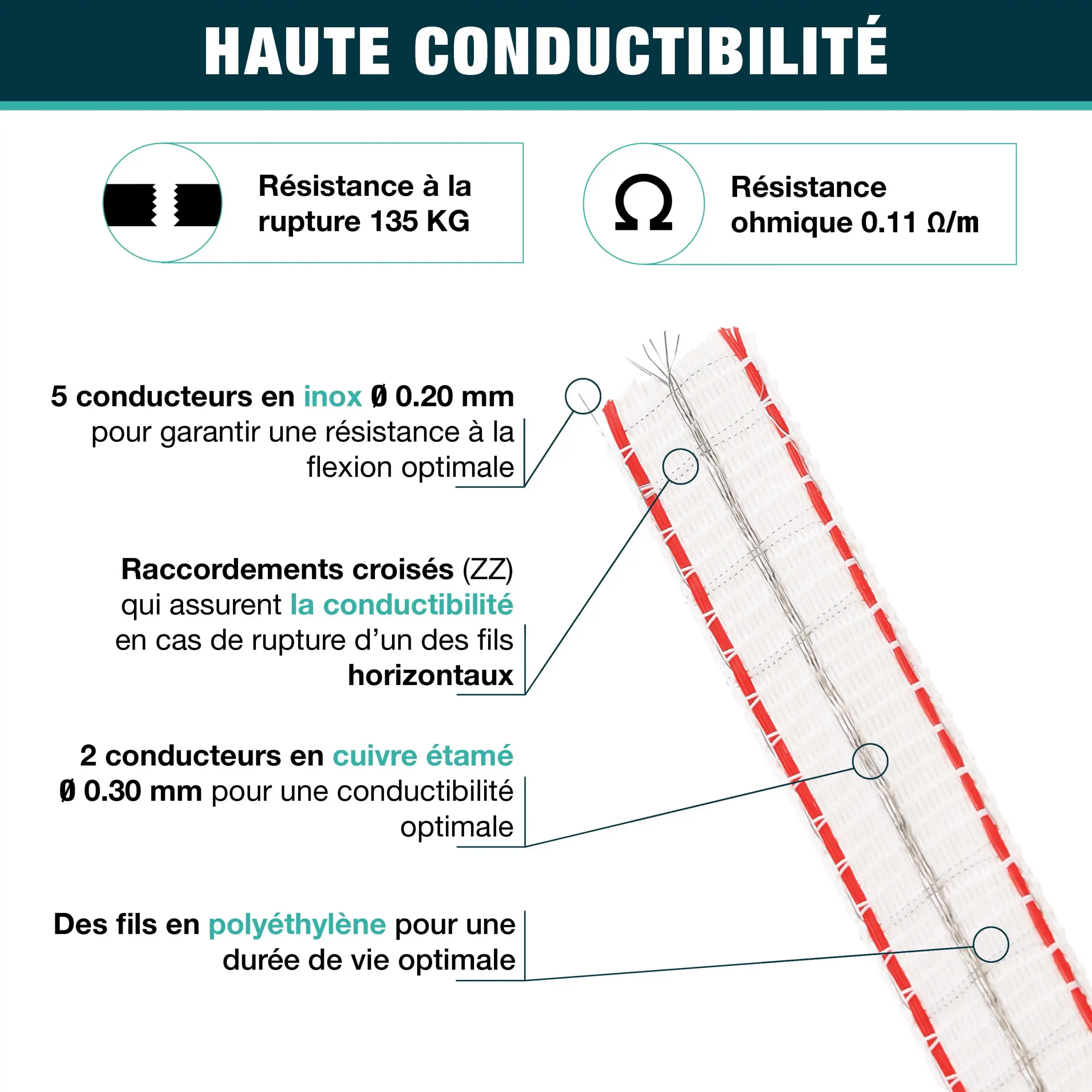 6 fils inox de Ø0,20mm, 2 fils cuivre Ø0,30mm ainsi que des raccordements croisés pour un meilleur parcours du courant. Les raccordements croisés prennent le relais en cas de casse d’un fil conducteur horizontal en assurant le passage du courant.